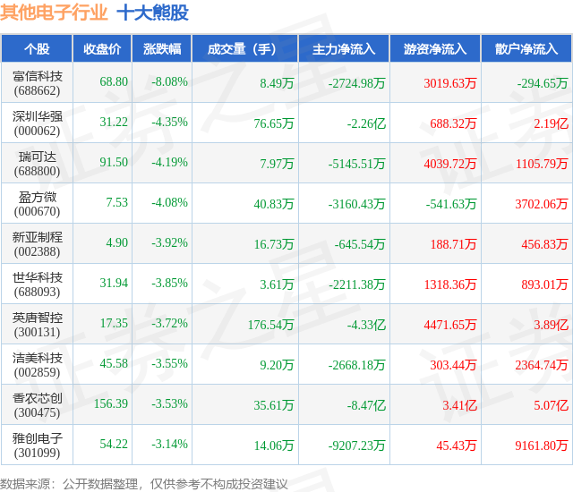 个股表现方面,其他电子行业当日领跌股为富信科技(688662),该股当日报收68.8,下跌8.08%,成交量8.49万,主力资金净流出2724.98万元。深圳华强(000062)以下跌4.35%紧随其后,该股当日成交量76.65万,主力资金净流出2.26亿元。除此之外,瑞可达(688800)、盈方微(000670)、新亚制程(002388)均进入当日熊股之列。具体个股列表见下表:
