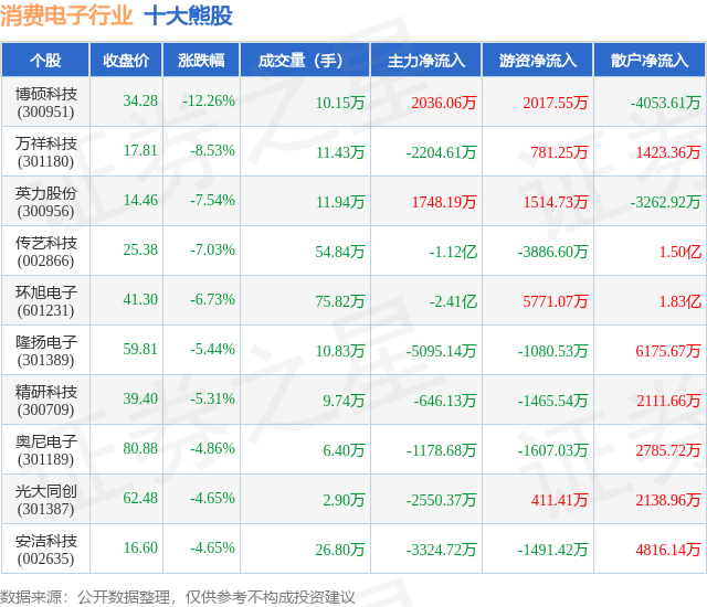 个股表现方面,消费电子行业当日领跌股为博硕科技(300951),该股当日报收34.28,下跌12.26%,成交量10.15万,主力资金净流入2036.06万元。万祥科技(301180)以下跌8.53%紧随其后,该股当日成交量11.43万,主力资金净流出2204.61万元。除此之外,英力股份(300956)、传艺科技(002866)、环旭电子(601231)均进入当日熊股之列。具体个股列表见下表:
