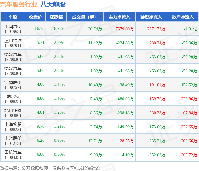 个股表现方面,汽车服务行业当日领跌股为中国汽研(601965),该股当日报收16.73,下跌6.22%,成交量30.74万,主力资金净流入7679.6万元。厦门信达(000701)以下跌2.39%紧随其后,该股当日成交量11.42万,主力资金净流出224.88万元。除此之外,德众汽车(920030)、德众汽车(920030)、浩物股份(000757)均进入当日熊股之列。具体个股列表见下表: