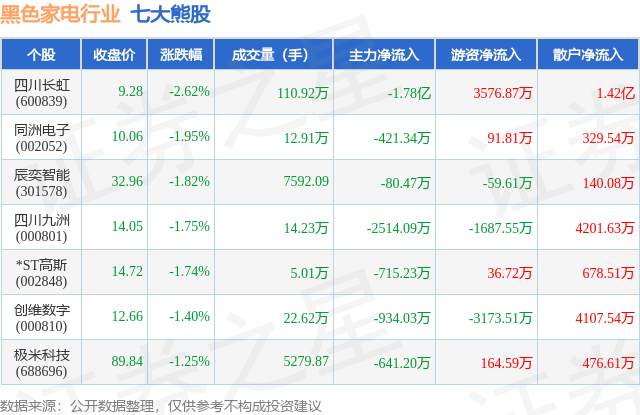 个股表现方面,黑色家电行业当日领跌股为四川长虹(600839),该股当日报收9.28,下跌2.62%,成交量110.92万,主力资金净流出1.78亿元。同洲电子(002052)以下跌1.95%紧随其后,该股当日成交量12.91万,主力资金净流出421.34万元。除此之外,辰奕智能(301578)、四川九洲(000801)、*ST高斯(002848)均进入当日熊股之列。具体个股列表见下表: