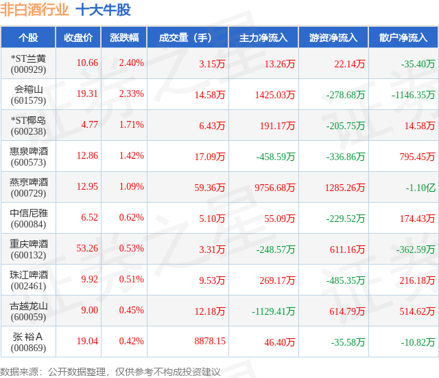 个股表现方面,非白酒行业当日领涨股为*ST兰黄(000929),该股当日报收10.66,上涨2.4%,成交量3.15万,主力资金净流入13.26万元。会稽山(601579)以上涨2.33%紧随其后,该股当日成交量14.58万,主力资金净流入1425.03万元。除此之外,*ST椰岛(600238)、惠泉啤酒(600573)、燕京啤酒(000729)均进入当日牛股之列。具体个股列表见下表: