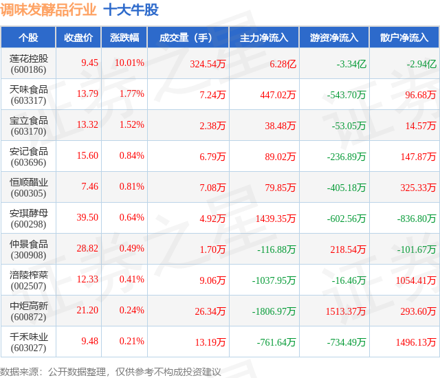 个股表现方面,调味发酵品行业当日领涨股为莲花控股(600186),该股当日报收9.45,上涨10.01%,成交量324.54万,主力资金净流入6.28亿元。天味食品(603317)以上涨1.77%紧随其后,该股当日成交量7.24万,主力资金净流入447.02万元。除此之外,宝立食品(603170)、安记食品(603696)、恒顺醋业(600305)均进入当日牛股之列。具体个股列表见下表: