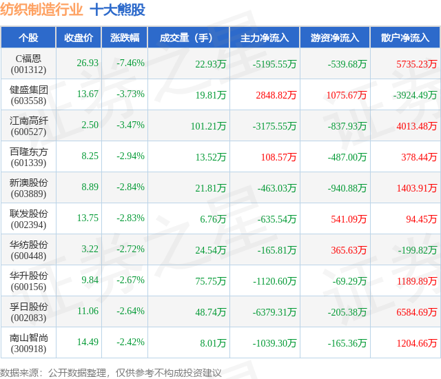 个股表现方面,纺织制造行业当日领跌股为C福恩(001312),该股当日报收26.93,下跌7.46%,成交量22.93万,主力资金净流出5195.55万元。健盛集团(603558)以下跌3.73%紧随其后,该股当日成交量19.81万,主力资金净流入2848.82万元。除此之外,江南高纤(600527)、百隆东方(601339)、新澳股份(603889)均进入当日熊股之列。具体个股列表见下表: