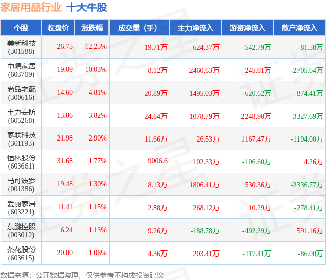 个股表现方面,家居用品行业当日领涨股为美新科技(301588),该股当日报收26.75,上涨12.25%,成交量19.71万,主力资金净流入624.37万元。中源家居(603709)以上涨10.03%紧随其后,该股当日成交量8.12万,主力资金净流入2460.63万元。除此之外,尚品宅配(300616)、王力安防(605268)、家联科技(301193)均进入当日牛股之列。具体个股列表见下表: