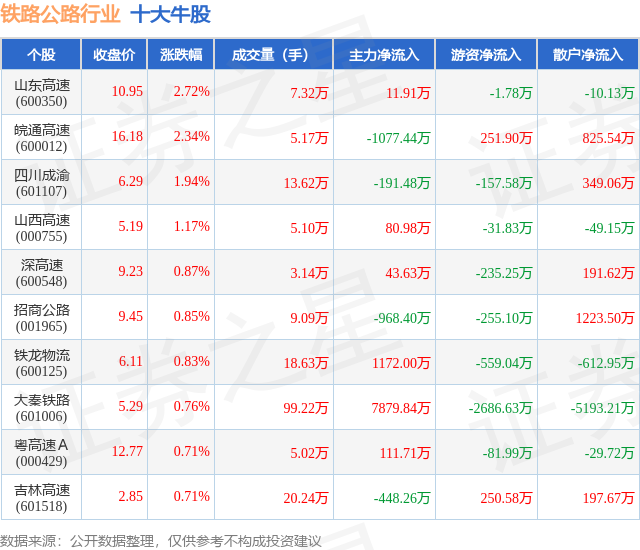 个股表现方面,铁路公路行业当日领涨股为山东高速(600350),该股当日报收10.95,上涨2.72%,成交量7.32万,主力资金净流入11.91万元。皖通高速(600012)以上涨2.34%紧随其后,该股当日成交量5.17万,主力资金净流出1077.44万元。除此之外,四川成渝(601107)、山西高速(000755)、深高速(600548)均进入当日牛股之列。具体个股列表见下表: