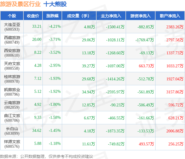 个股表现方面,旅游及景区行业当日领跌股为大连圣亚(600593),该股当日报收33.21,下跌4.21%,成交量4.8万,主力资金净流出1500.41万元。西藏旅游(600749)以下跌3.71%紧随其后,该股当日成交量29.06万,主力资金净流出1028.11万元。除此之外,西安旅游(000610)、天府文旅(000558)、桂林旅游(000978)均进入当日熊股之列。具体个股列表见下表: