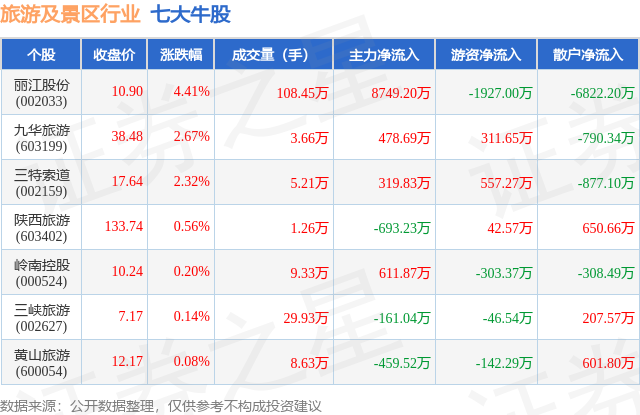 个股表现方面,旅游及景区行业当日领涨股为丽江股份(002033),该股当日报收10.9,上涨4.41%,成交量108.45万,主力资金净流入8749.2万元。九华旅游(603199)以上涨2.67%紧随其后,该股当日成交量3.66万,主力资金净流入478.69万元。除此之外,三特索道(002159)、陕西旅游(603402)、岭南控股(000524)均进入当日牛股之列。具体个股列表见下表: