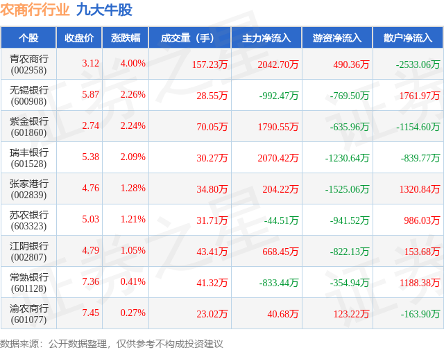 个股表现方面,农商行行业当日领涨股为青农商行(002958),该股当日报收3.12,上涨4.0%,成交量157.23万,主力资金净流入2042.7万元。无锡银行(600908)以上涨2.26%紧随其后,该股当日成交量28.55万,主力资金净流出992.47万元。除此之外,紫金银行(601860)、瑞丰银行(601528)、张家港行(002839)均进入当日牛股之列。具体个股列表见下表: