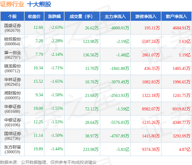 个股表现方面,证券行业当日领跌股为国盛证券(002670),该股当日报收12.6,下跌2.63%,成交量26.62万,主力资金净流出4800.01万元。哈投股份(600864)以下跌2.28%紧随其后,该股当日成交量123.98万,主力资金净流出2.19亿元。除此之外,第一创业(002797)、锦龙股份(000712)、华林证券(002945)均进入当日熊股之列。具体个股列表见下表: