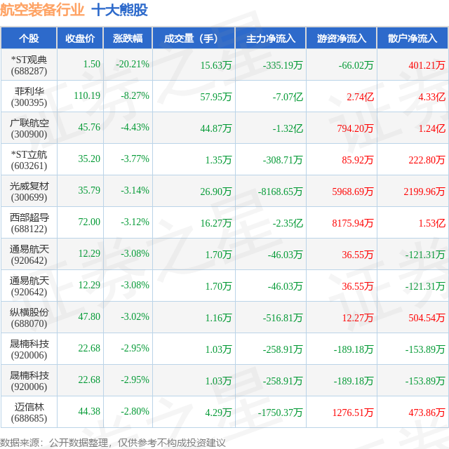 个股表现方面,航空装备行业当日领跌股为*ST观典(688287),该股当日报收1.5,下跌20.21%,成交量15.63万,主力资金净流出335.19万元。菲利华(300395)以下跌8.27%紧随其后,该股当日成交量57.95万,主力资金净流出7.07亿元。除此之外,广联航空(300900)、*ST立航(603261)、光威复材(300699)均进入当日熊股之列。具体个股列表见下表: