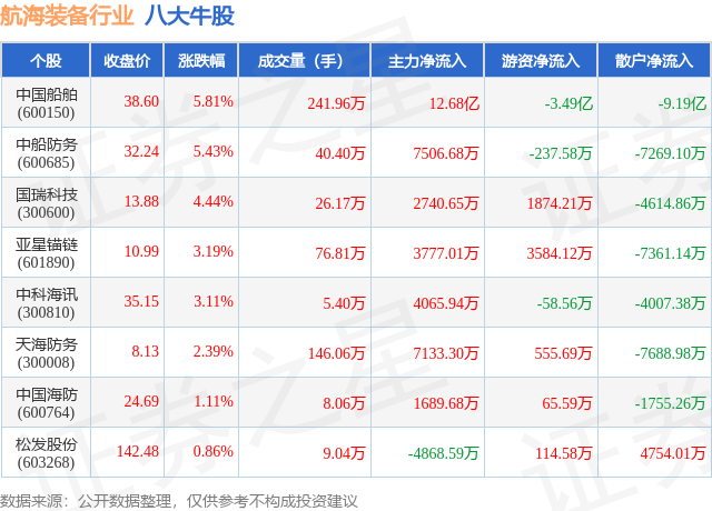个股表现方面,航海装备行业当日领涨股为中国船舶(600150),该股当日报收38.6,上涨5.81%,成交量241.96万,主力资金净流入12.68亿元。中船防务(600685)以上涨5.43%紧随其后,该股当日成交量40.4万,主力资金净流入7506.68万元。除此之外,国瑞科技(300600)、亚星锚链(601890)、中科海讯(300810)均进入当日牛股之列。具体个股列表见下表: