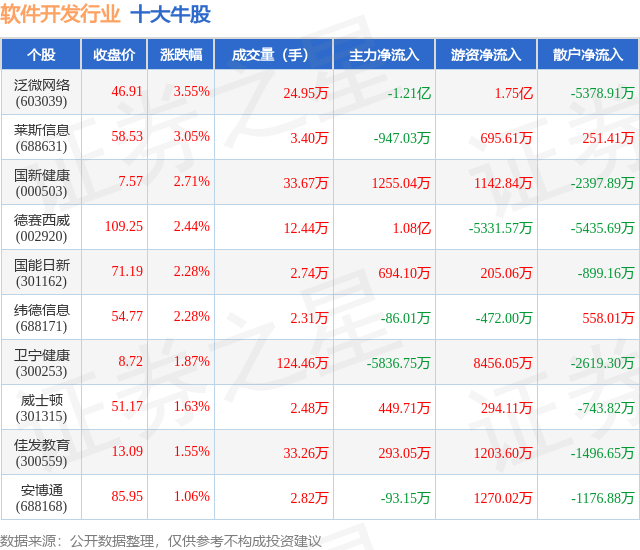 个股表现方面,软件开发行业当日领涨股为泛微网络(603039),该股当日报收46.91,上涨3.55%,成交量24.95万,主力资金净流出1.21亿元。莱斯信息(688631)以上涨3.05%紧随其后,该股当日成交量3.4万,主力资金净流出947.03万元。除此之外,国新健康(000503)、德赛西威(002920)、国能日新(301162)均进入当日牛股之列。具体个股列表见下表: