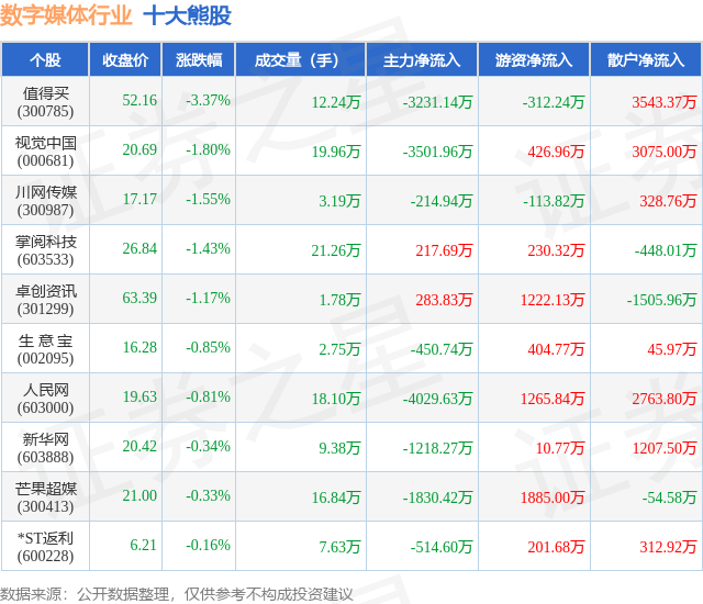 个股表现方面,数字媒体行业当日领跌股为值得买(300785),该股当日报收52.16,下跌3.37%,成交量12.24万,主力资金净流出3231.14万元。视觉中国(000681)以下跌1.8%紧随其后,该股当日成交量19.96万,主力资金净流出3501.96万元。除此之外,川网传媒(300987)、掌阅科技(603533)、卓创资讯(301299)均进入当日熊股之列。具体个股列表见下表:
