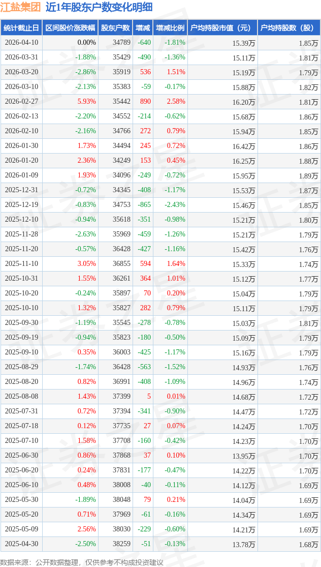 从股价来看,2026年3月31日至2026年4月10日,江盐集团区间跌幅为0.0%,在此期间股东户数减少640.0户,减幅为1.81%。
