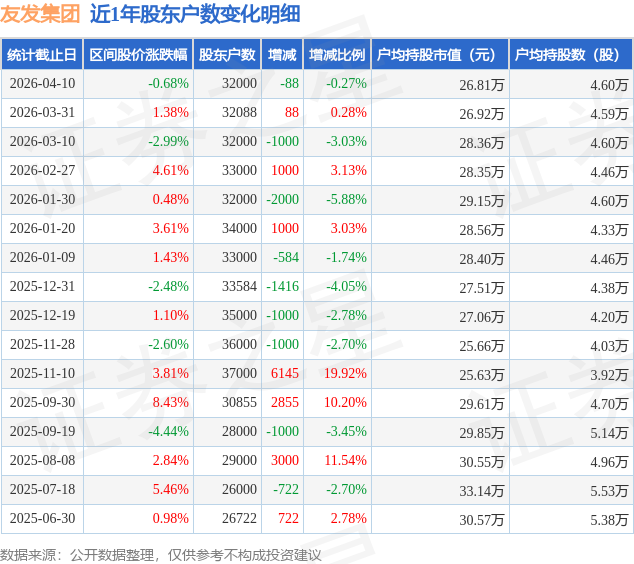 证券之星消息,近日友发集团披露,截至2026年4月10日公司股东户数为3.2万户,较3月31日减少88.0户,减幅为0.27%。户均持股数量由上期的4.59万股增加至4.6万股,户均持股市值为26.81万元。
