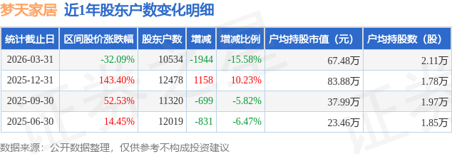 从股价来看,2025年12月31日至2026年3月31日,梦天家居区间跌幅为32.09%,在此期间股东户数减少1944.0户,减幅为15.58%。