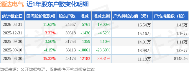 证券之星消息,近日通达电气披露,截至2026年3月31日公司股东户数为2.46万户,较12月31日减少5761.0户,减幅为19.0%。户均持股数量由上期的1.16万股增加至1.43万股,户均持股市值为16.54万元。