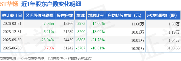 从股价来看,2025年12月31日至2026年3月31日,ST华扬区间跌幅为7.06%,在此期间股东户数减少2973.0户,减幅为14.0%。