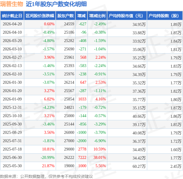 从股价来看,2026年4月10日至2026年4月20日,瑞普生物区间涨幅为0.6%,在此期间股东户数减少627.0户,减幅为2.49%。