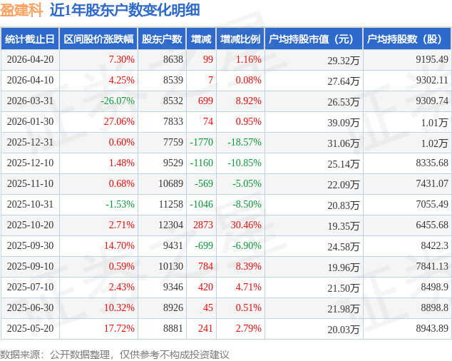 证券之星消息,近日盈建科披露,截至2026年4月20日公司股东户数为8638.0户,较4月10日增加99.0户,增幅为1.16%。户均持股数量由上期的9302.0股减少至9195.0股,户均持股市值为29.32万元。