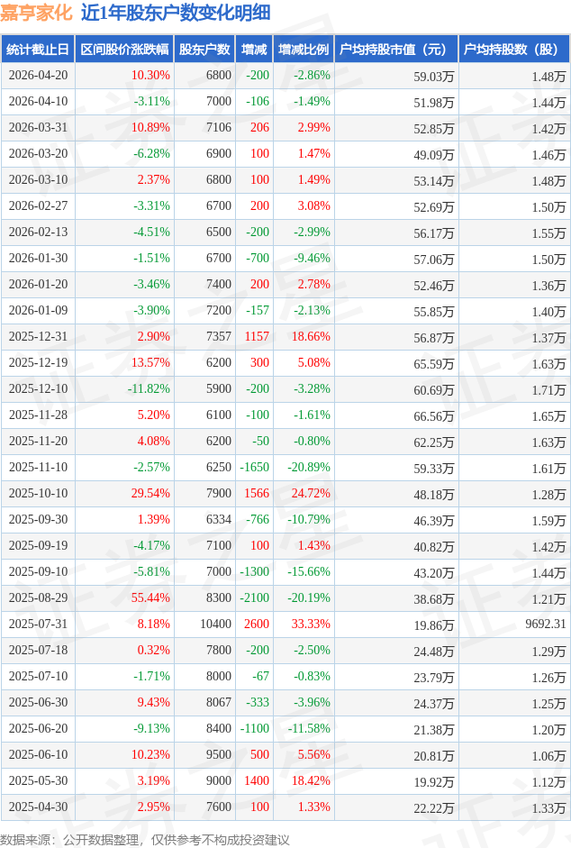 从股价来看,2026年4月10日至2026年4月20日,嘉亨家化区间涨幅为10.3%,在此期间股东户数减少200.0户,减幅为2.86%。