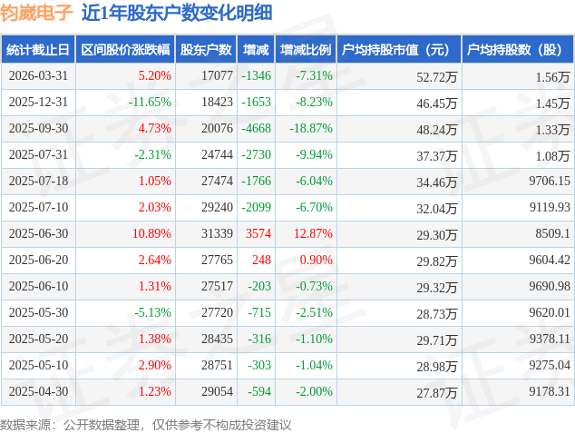 从股价来看,2025年12月31日至2026年3月31日,钧崴电子区间涨幅为5.2%,在此期间股东户数减少1346.0户,减幅为7.31%。