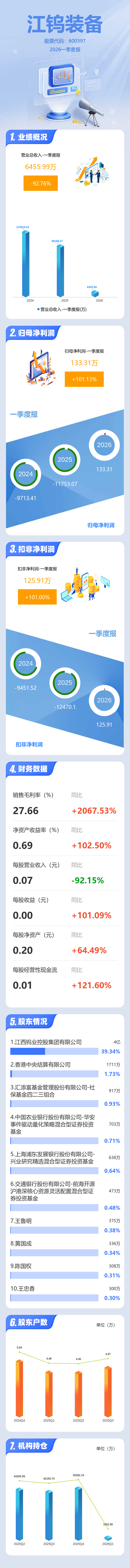 证券之星消息,江钨装备2026年一季报显示,一季度公司主营收入6455.99万元,同比下降92.76%;归母净利润133.31万元,同比上升101.13%;扣非净利润125.91万元,同比上升101.01%;负债率53.49%,财务费用65.97万元,毛利率27.66%。