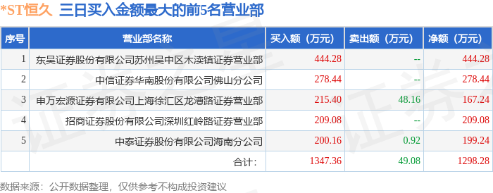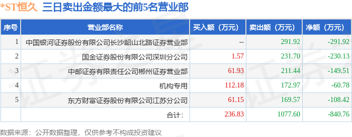 证券之星消息,沪深交易所2026年4月23日公布的交易公开信息显示,*ST恒久(002808)因连续三个交易日内,跌幅偏离值累计达到12%的ST证券、*ST证券和未完成股改证券登上龙虎榜。此次是近5个交易日内第2次上榜。