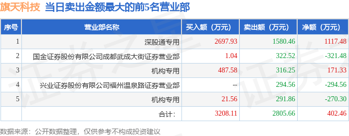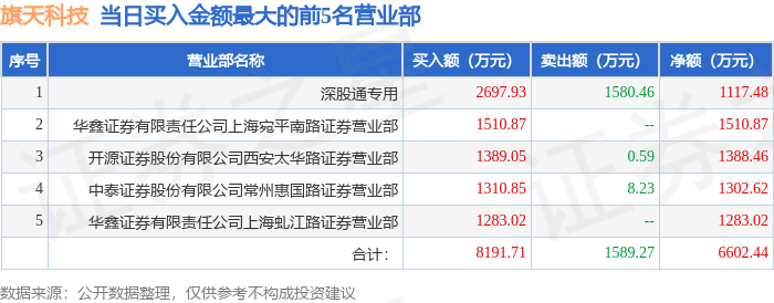 证券之星消息,沪深交易所2026年4月23日公布的交易公开信息显示,旗天科技(300061)因日涨幅达到15%的前5只证券登上龙虎榜。此次是近5个交易日内第1次上榜。
