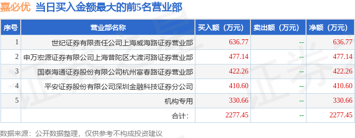 证券小知识:龙虎榜是交易所披露的竞价交易公开信息,现身龙虎榜的个股都是当日最为活跃的个股,是投资者日常重点关注的数据。交易所公布当日买入金额和卖出金额前五名的席位,其中一些席位代表特殊意义,如机构专用席位是指基金专用席位、券商自营专用席位、社保专用席位、券商理财专用席位、保险机构专用席位、保险机构租用席位、QFII专用席位等机构投资者买卖证券的专用通道和席位。深股通专用、沪股通专用为北向资金的交易席位。