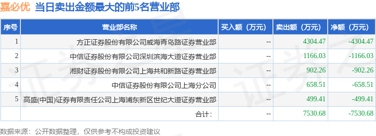 证券之星消息,沪深交易所2026年4月23日公布的交易公开信息显示,嘉必优(688089)因有价格涨跌幅限制的日收盘价格跌幅达到15%的前五只证券登上龙虎榜。此次是近5个交易日内第1次上榜。