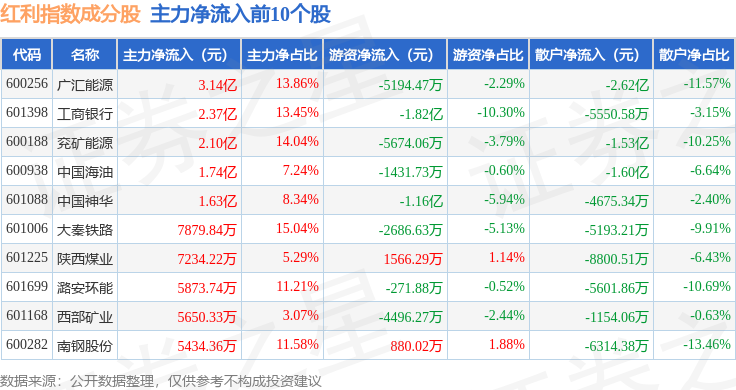 资金流向方面,红利指数(000015)成份股当日主力资金净流入合计8.92亿元,游资资金净流出合计5561.6万元,散户资金净流出合计8.37亿元。成份股资金流向详情见下表: