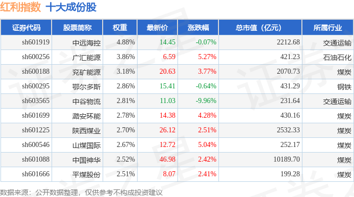 证券之星消息,4月23日,红利指数(000015)报收于3284.4点,涨0.7%,成交398.01亿元,换手率0.26%。当日该指数成份股中,上涨的有33家,广汇能源以5.27%的涨幅领涨,下跌的有16家,中谷物流以9.96%的跌幅领跌。