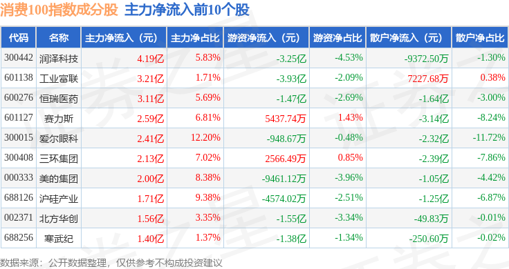 资金流向方面,消费100(399364)指数成份股当日主力资金净流出合计177.28亿元,游资资金净流入合计68.15亿元,散户资金净流入合计109.14亿元。成份股资金流向详情见下表: