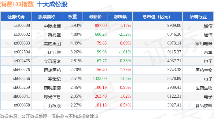 消费100(399364)指数十大成份股详情如下: