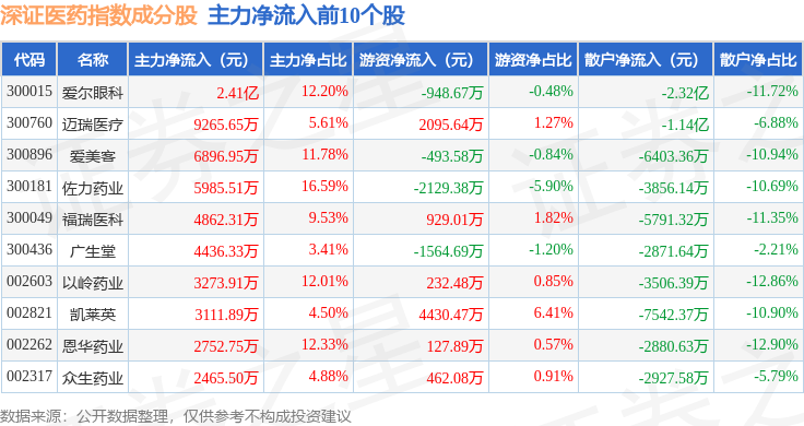 资金流向方面,深证医药(399618)指数成份股当日主力资金净流出合计6.79亿元,游资资金净流入合计3.85亿元,散户资金净流入合计2.94亿元。成份股资金流向详情见下表: