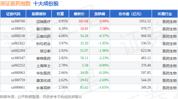 深证医药(399618)指数十大成份股详情如下: