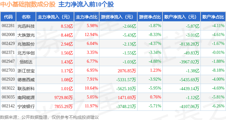资金流向方面,中小基础(399623)指数成份股当日主力资金净流出合计192.05亿元,游资资金净流入合计17.12亿元,散户资金净流入合计174.93亿元。成份股资金流向详情见下表: