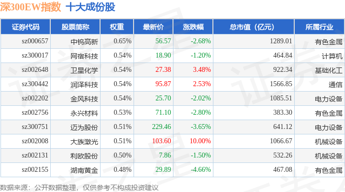 深300EW(399633)指数十大成份股详情如下:
