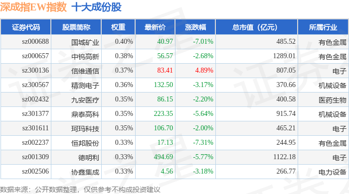 证券之星消息,4月23日,深成指EW(399659)指数报收于5153.28点,跌0.89%,成交8198.02亿元,换手率2.18%。当日该指数成份股中,上涨的有141家,贝达药业以12.97%的涨幅领涨,下跌的有352家,赛微电子以18.21%的跌幅领跌。