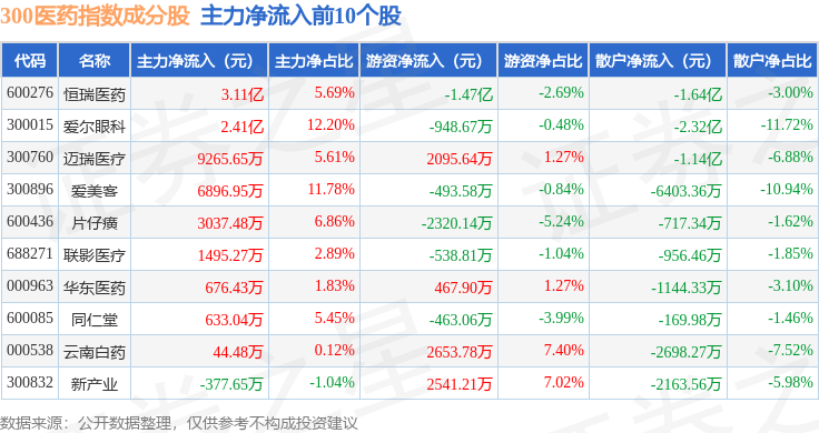 资金流向方面,300医药(399913)指数成份股当日主力资金净流入合计1.95亿元,游资资金净流入合计1.67亿元,散户资金净流出合计3.62亿元。成份股资金流向详情见下表:
