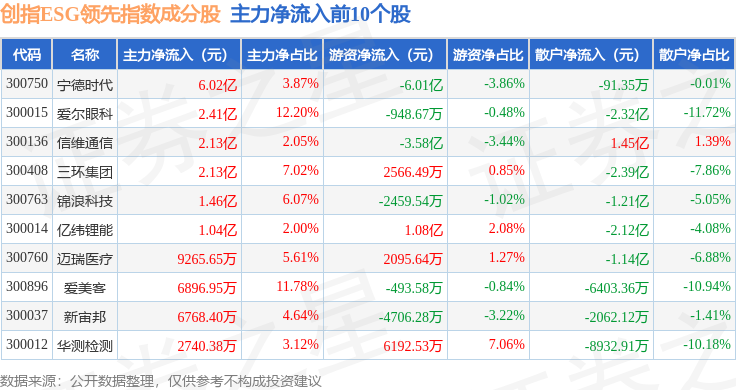 资金流向方面,创指ESG领先(970031)指数成份股当日主力资金净流出合计64.23亿元,游资资金净流入合计17.46亿元,散户资金净流入合计46.77亿元。成份股资金流向详情见下表: