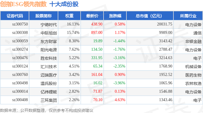 创指ESG领先(970031)指数十大成份股详情如下: