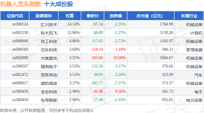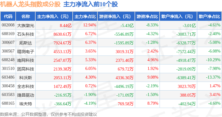 资金流向方面,机器人龙头(980071)指数成份股当日主力资金净流出合计34.64亿元,游资资金净流入合计14.17亿元,散户资金净流入合计20.47亿元。成份股资金流向详情见下表: