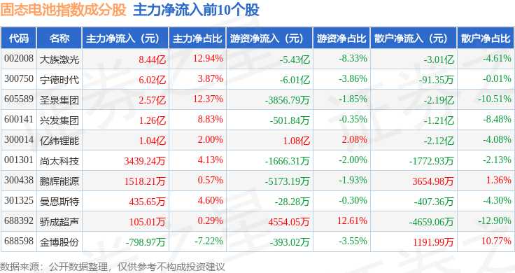 资金流向方面,固态电池(980140)指数成份股当日主力资金净流出合计44.32亿元,游资资金净流出合计3.06亿元,散户资金净流入合计46.83亿元。成份股资金流向详情见下表: