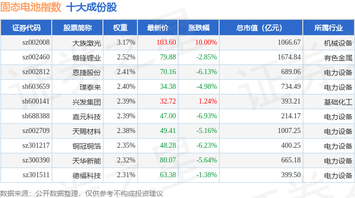 证券之星消息,4月23日,固态电池(980140)指数报收于1540.71点,跌2.11%,成交959.96亿元,换手率4.32%。当日该指数成份股中,上涨的有9家,大族激光以10.0%的涨幅领涨,下跌的有41家,嘉元科技以6.93%的跌幅领跌。