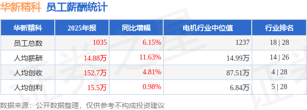 证券之星消息,4月24日华新精科公布2025年年报,当年营收15.8亿元,同比增11.26%;净利润为1.65亿元,同比增7.99%。根据财报数据披露,当年公司员工总数1035人,同比增6.15%;人均薪酬14.88万元,同比增11.63%;人均创收152.7万元,同比增4.81%;人均创利15.5万元,同比增0.98%;公司员工薪酬统计见下表: