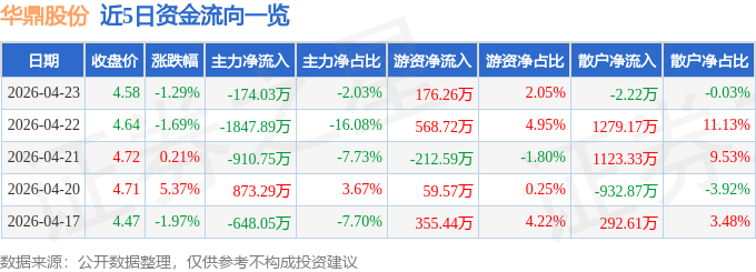 证券之星消息,截至2026年4月23日收盘,华鼎股份(601113)报收于4.58元,下跌1.29%,换手率1.69%,成交量18.68万手,成交额8589.09万元。