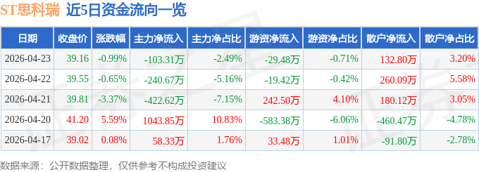 证券之星消息,截至2026年4月23日收盘,ST思科瑞(688053)报收于39.16元,下跌0.99%,换手率1.05%,成交量1.05万手,成交额4155.25万元。