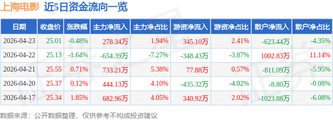 证券之星消息,截至2026年4月23日收盘,上海电影(601595)报收于25.01元,下跌0.48%,换手率1.28%,成交量5.74万手,成交额1.43亿元。
